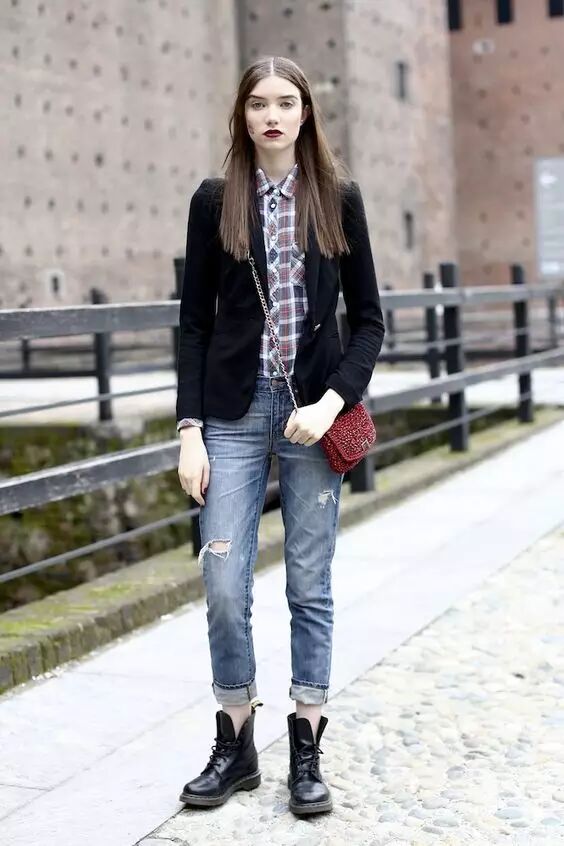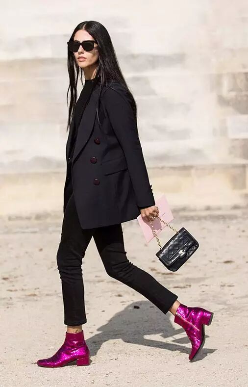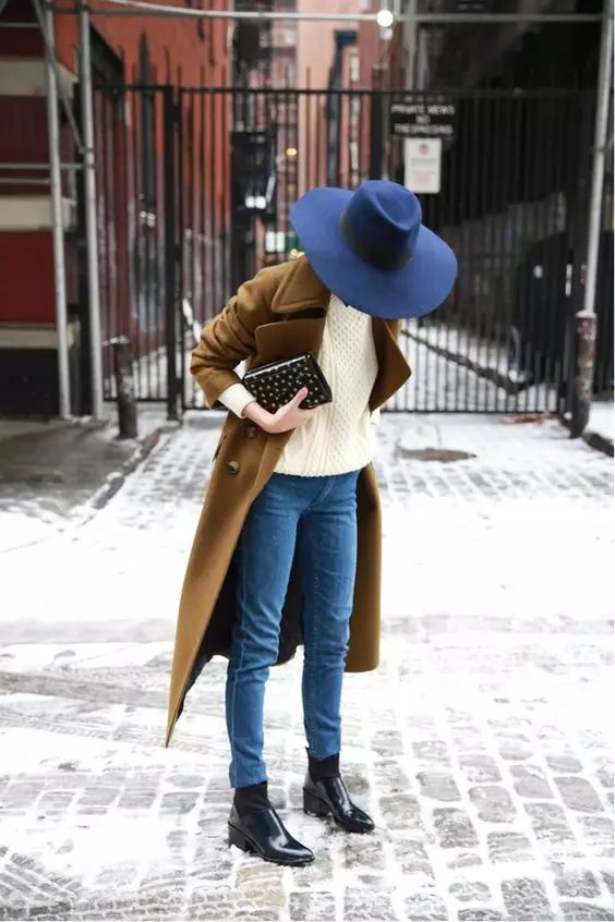 深蓝双排扣短大衣 红黑尖头靴 紧身牛仔裤