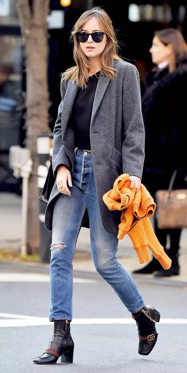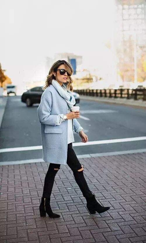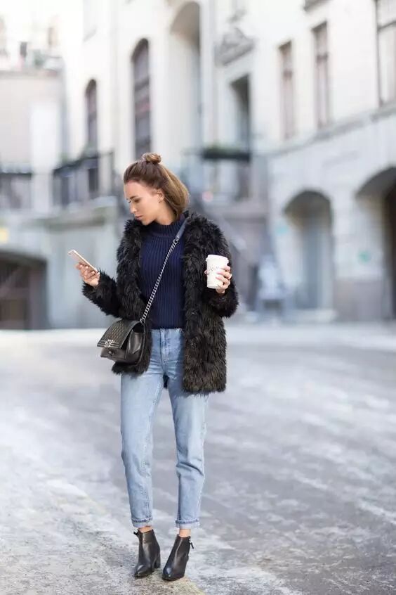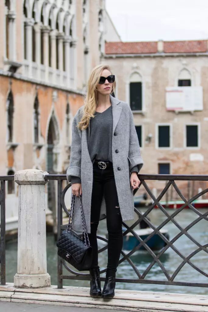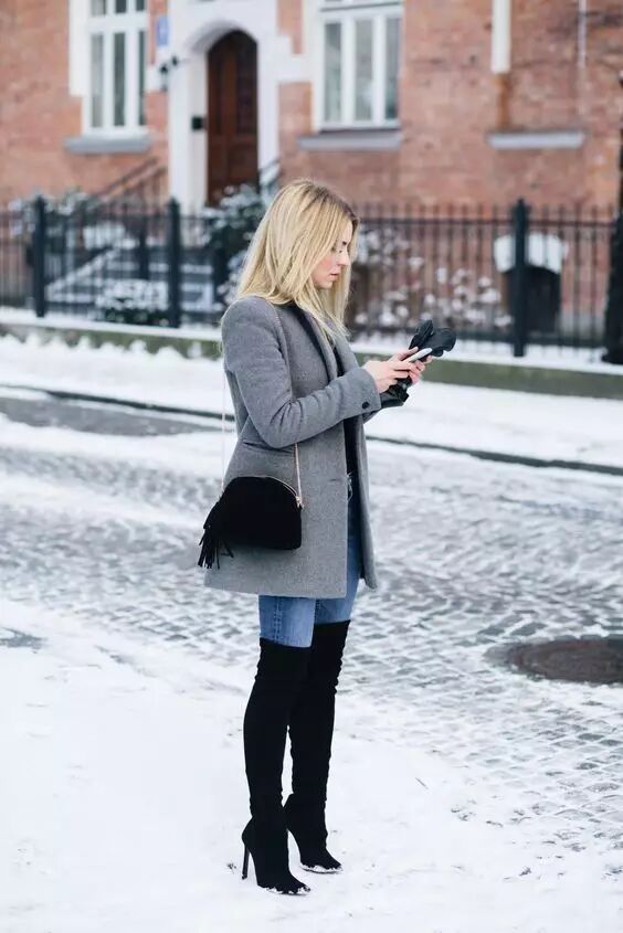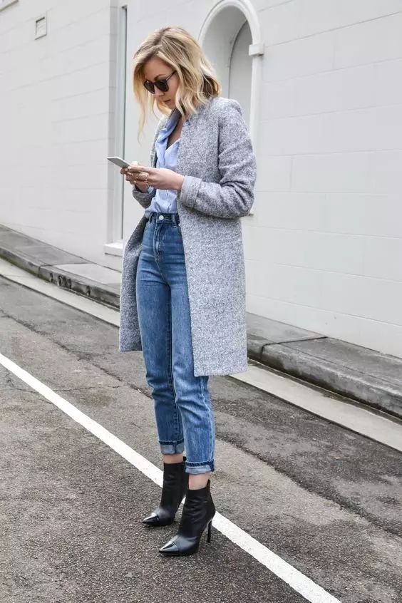 黑色的尖头细高跟 卷边高腰牛仔裤 灰色大衣