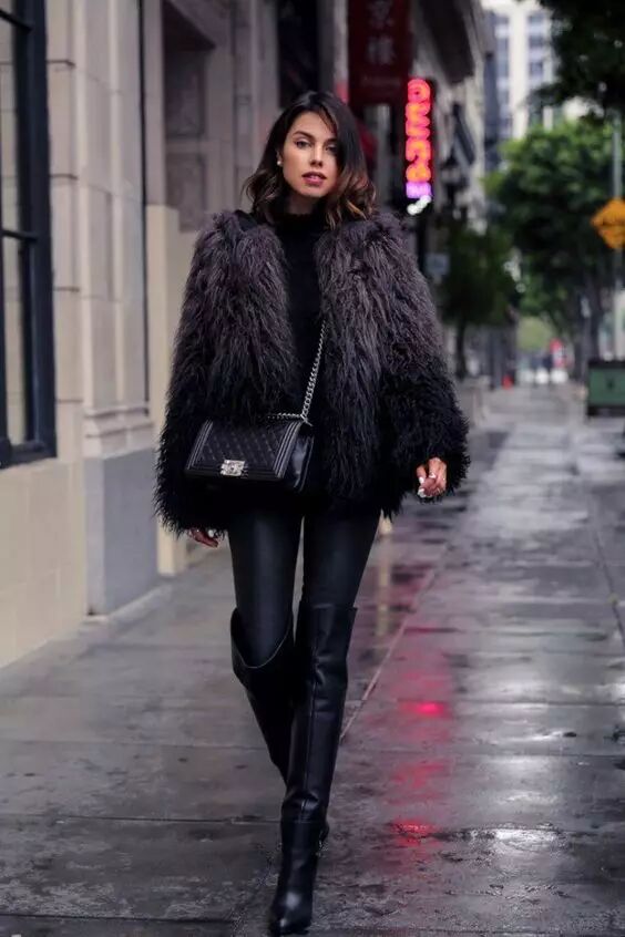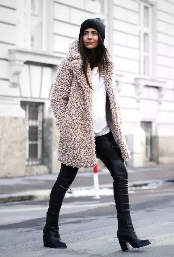 及踝靴 黑色铅笔裤 羊羔绒短外套