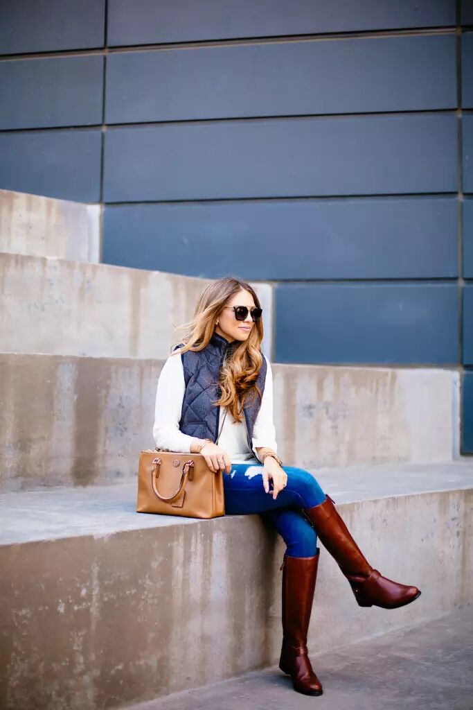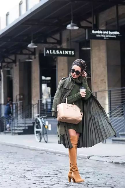 橄榄绿毛衣裙 棕色过膝靴 裸粉手提包
