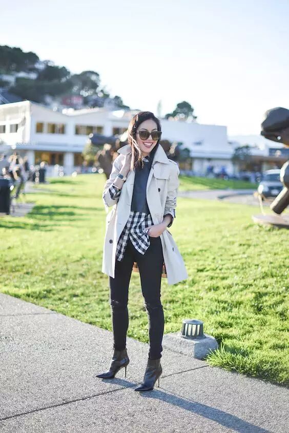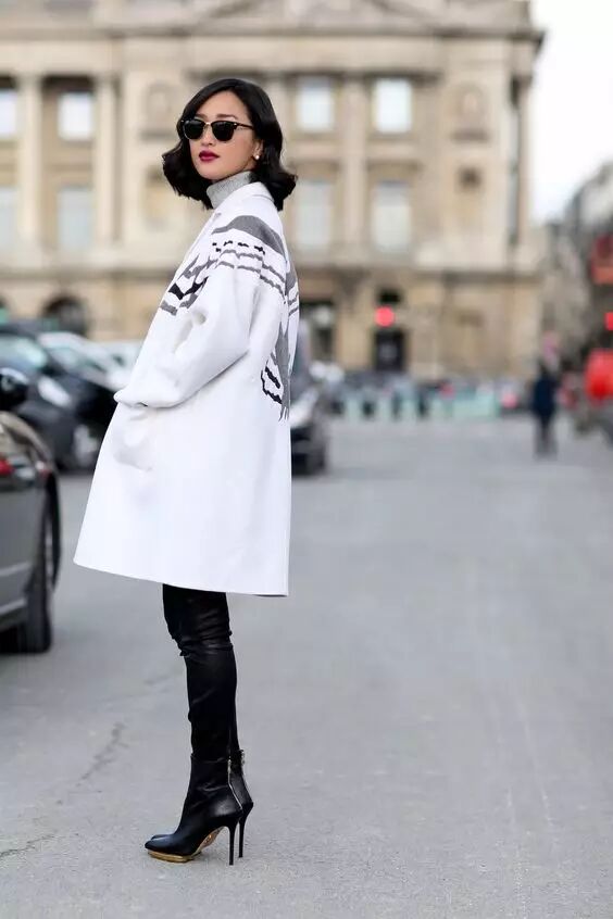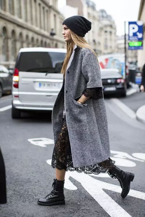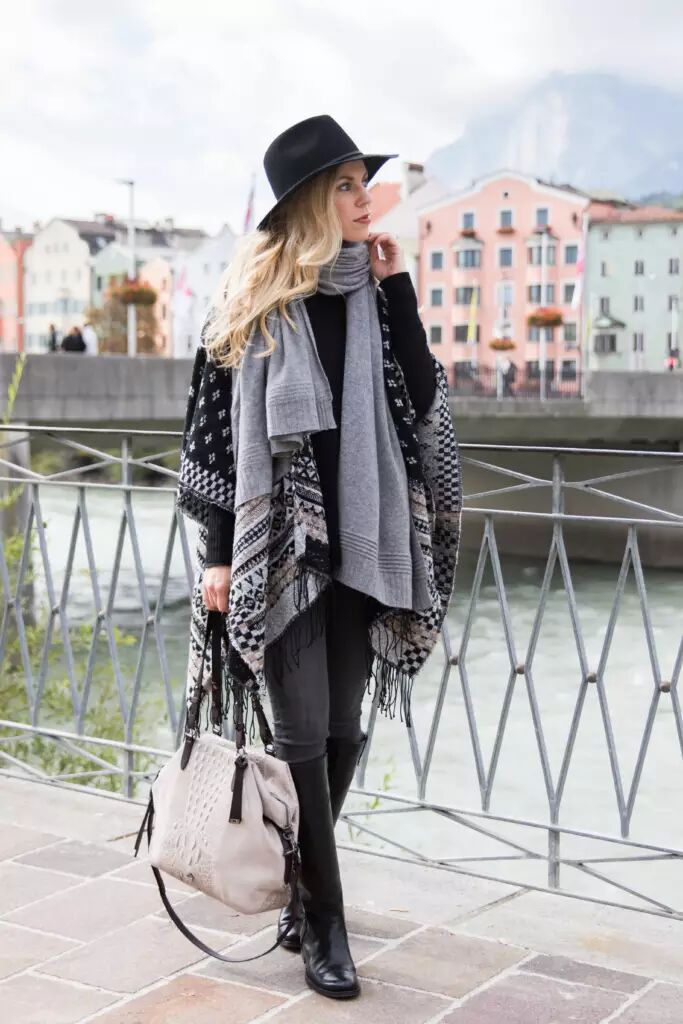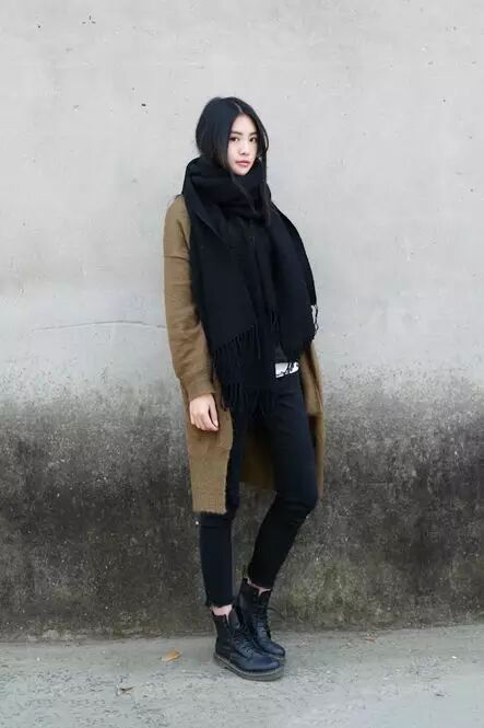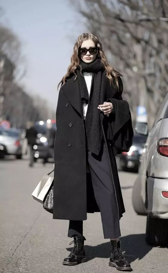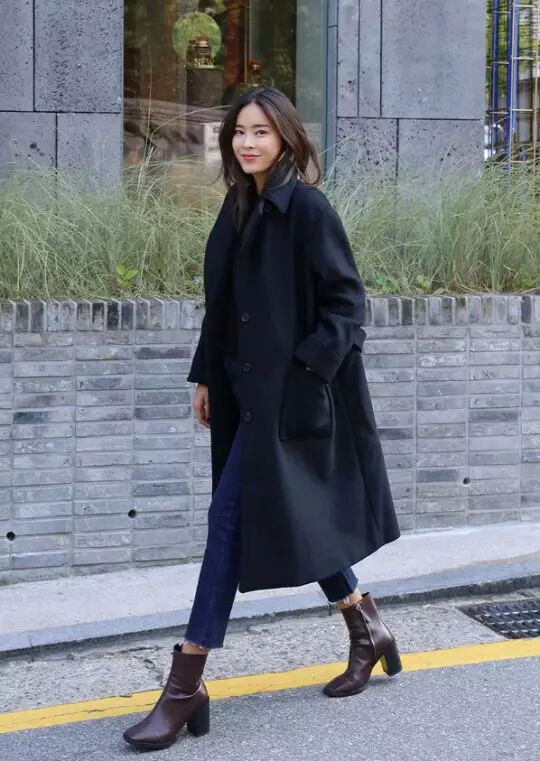黑色马靴 烟灰牛仔裤 斗篷大衣