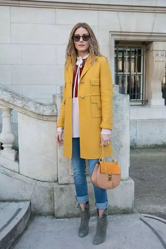 墨绿系带高跟靴 芥黄大衣 系带衬衫