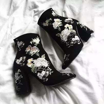 紫色丝绒及踝靴 驼色羊羔绒大衣