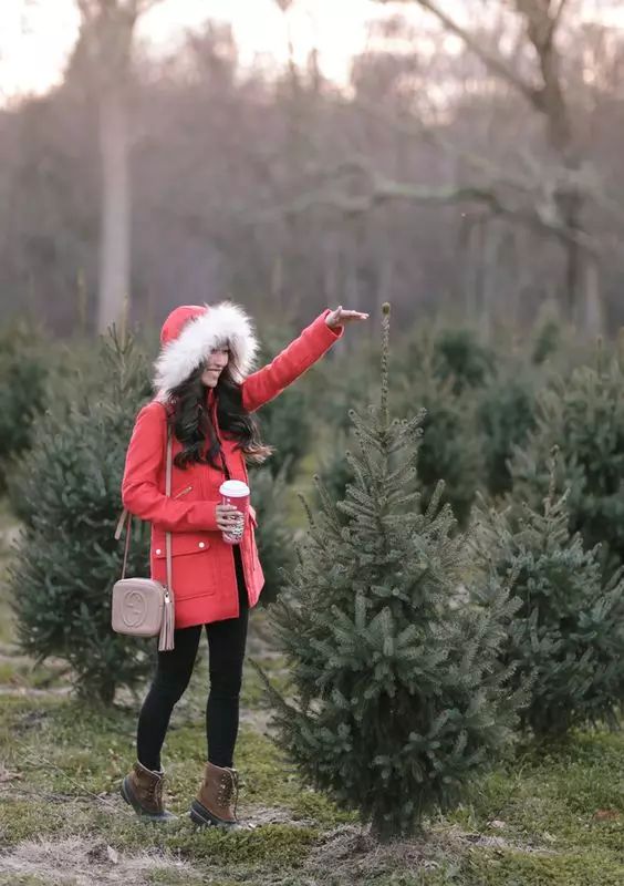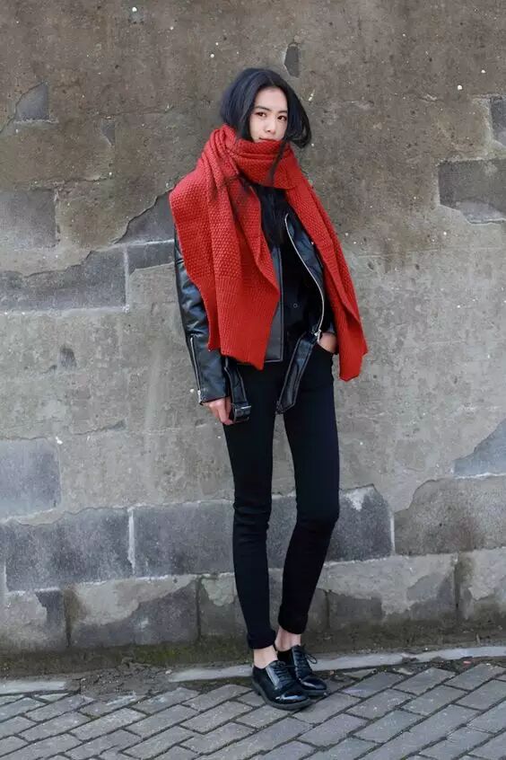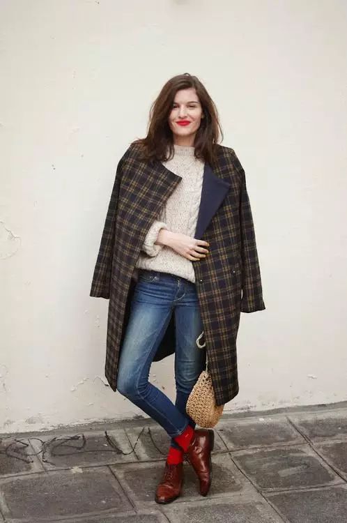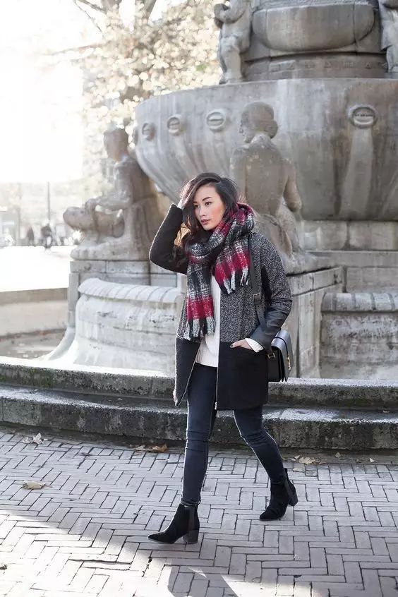 低调的红黑格纹围巾细节十足,些许点缀就很应景~