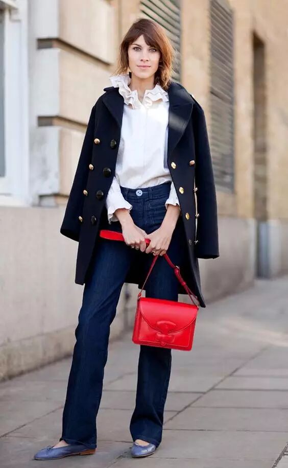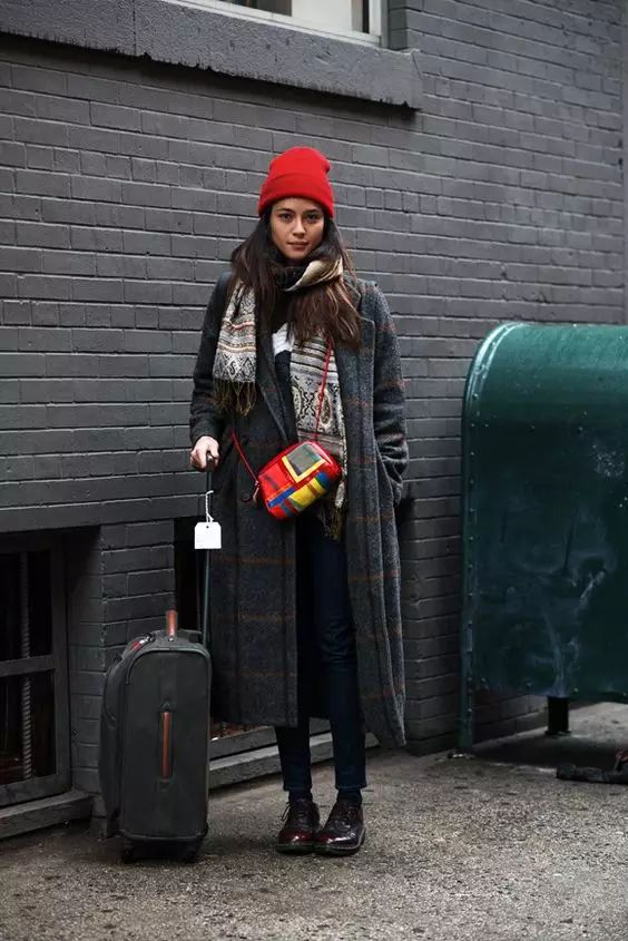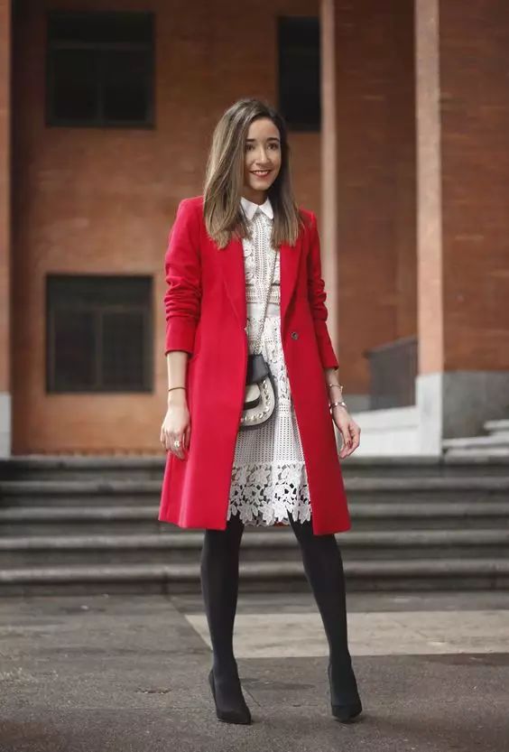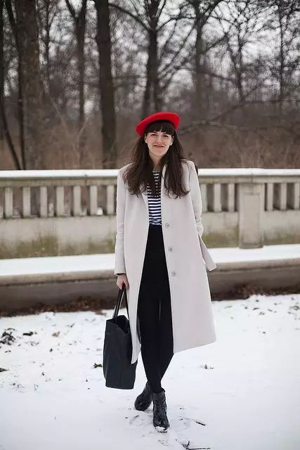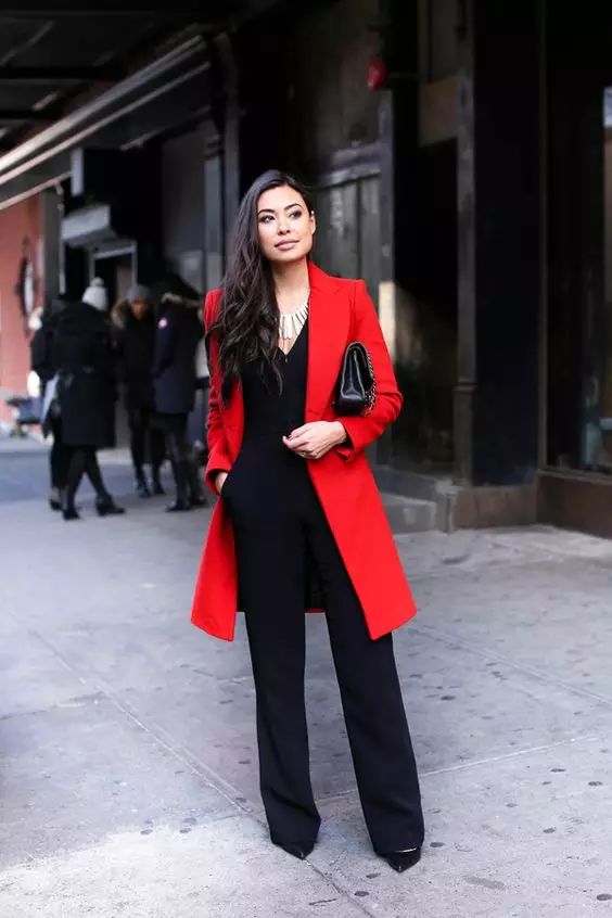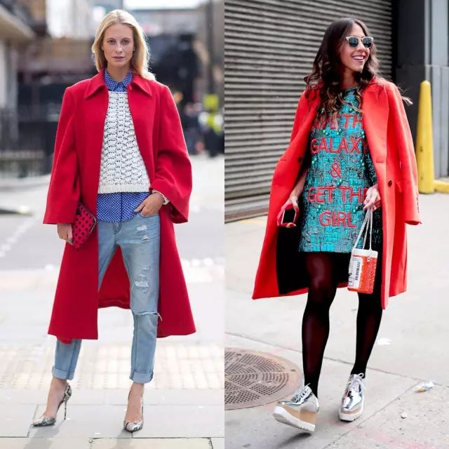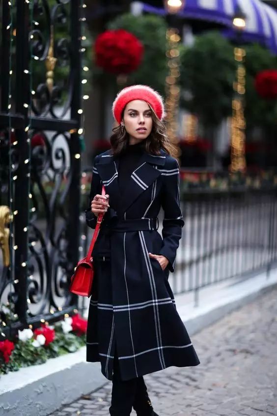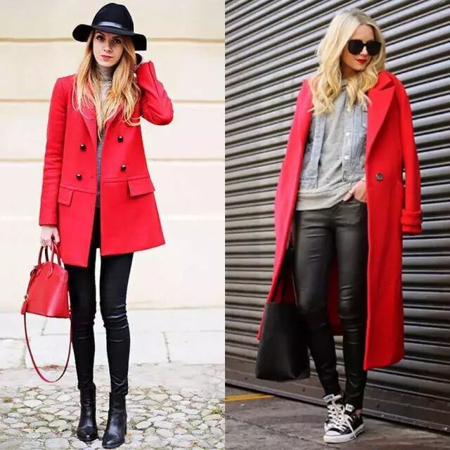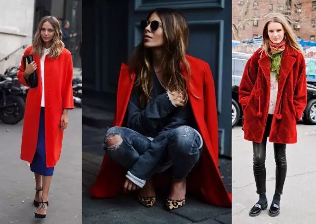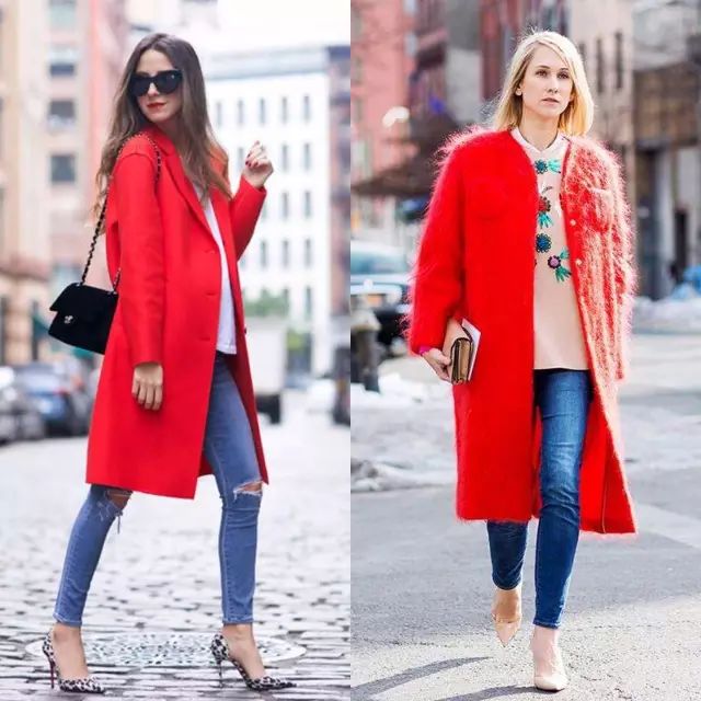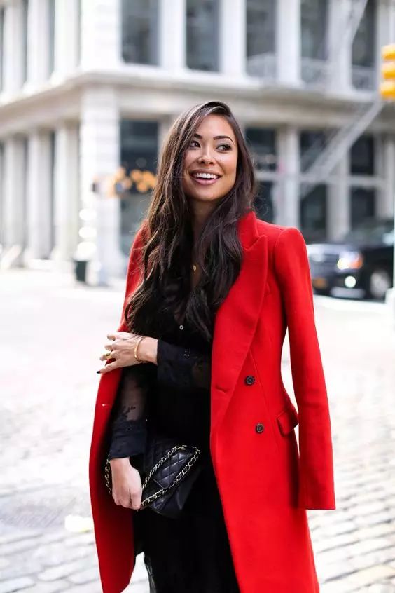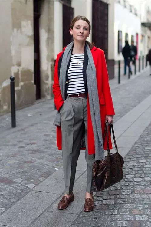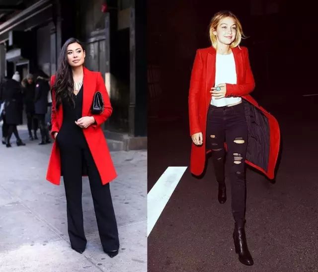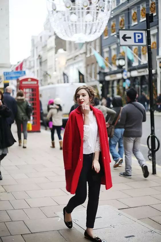 红大衣的搭配很简单,基础的黑白灰就能很得体。