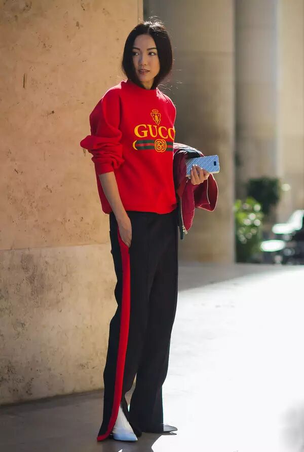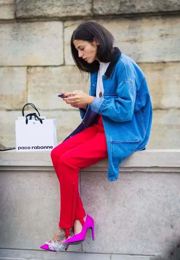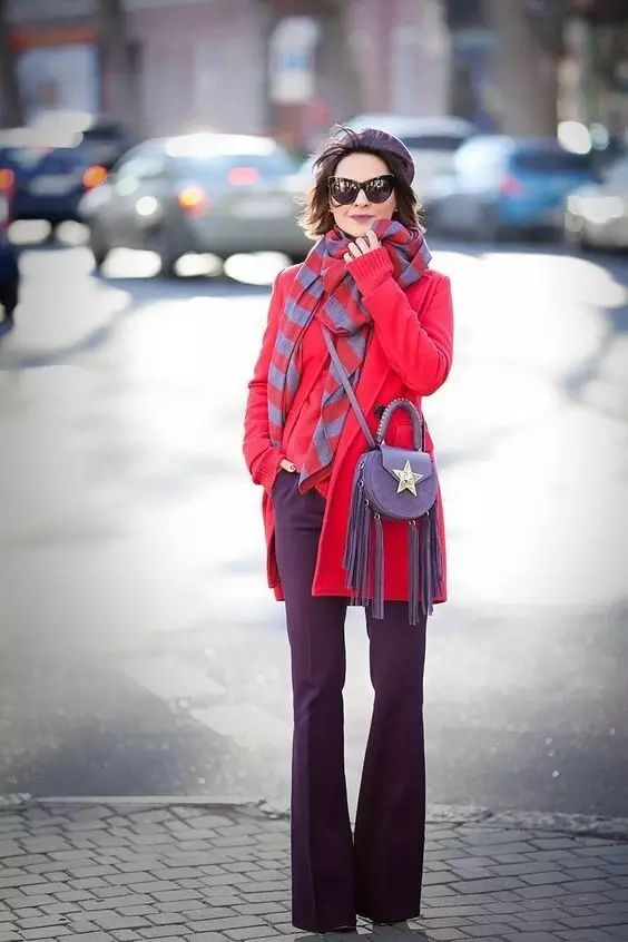 配上十分抢眼的红色踩脚裤和紫红色的高跟鞋,