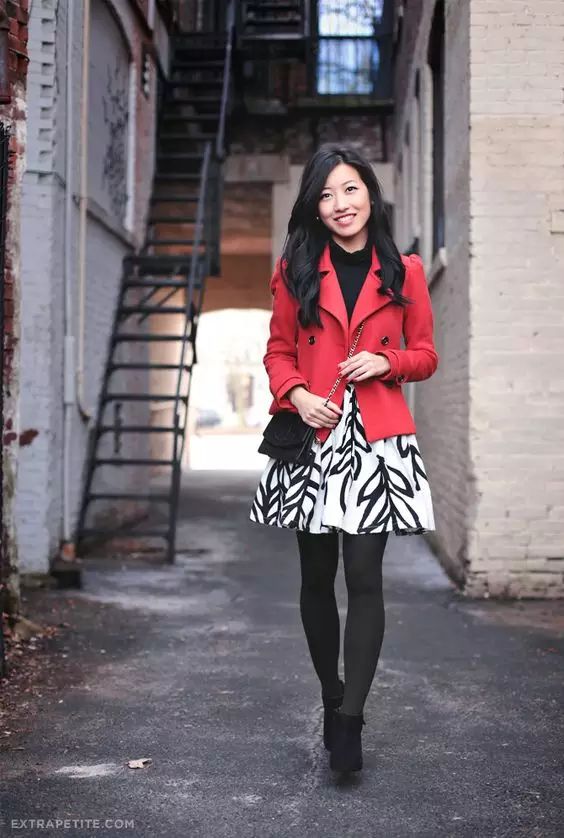娇小女生穿剪裁合身的短款红大衣+A字裙,