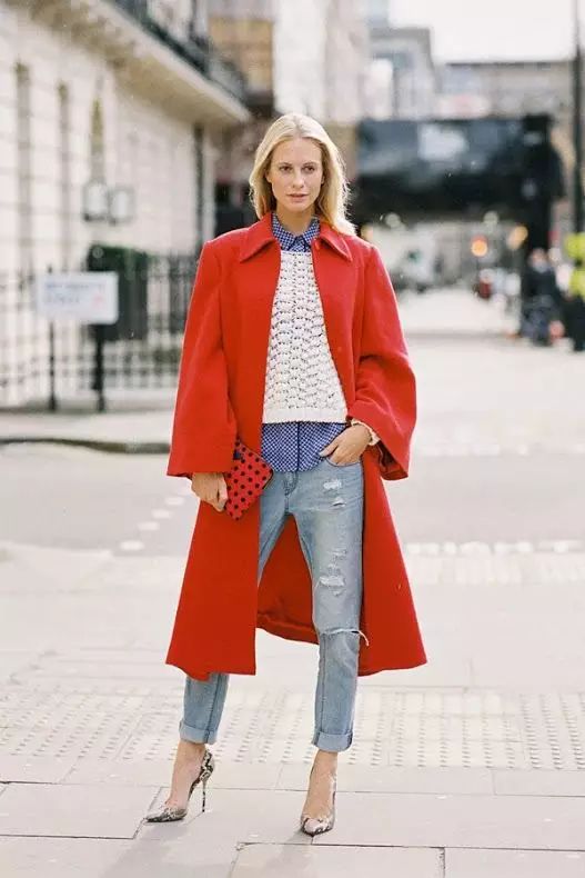 灰毛衣+灰牛仔裤让高饱和度大衣更显质感。