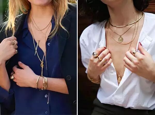 衬衫与精巧细致的项链、手链、戒指相搭配,