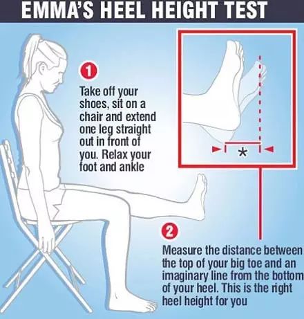 大家在家的时候可以自己测试一下噢,如果脚放松前后的角度为直角,说明踝关节较低,适合穿平底鞋。如果是悬着的,*表示的距离就是最舒服的高度。