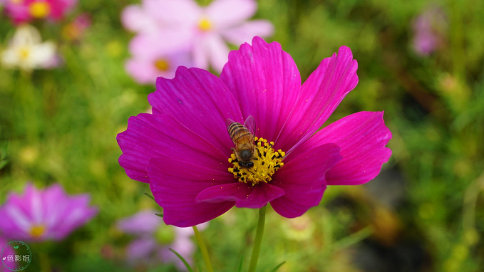 看看这只蜜蜂,在一株波斯菊上面流连忘返。