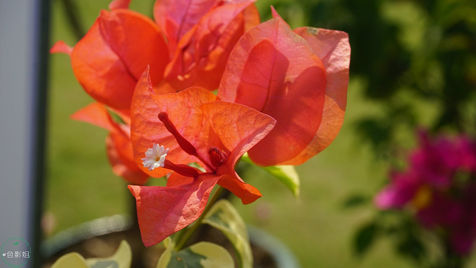 橙冰三角梅,橙红橙红的花苞,在阳光下鲜艳欲滴,花蕊上现出一朵白色的小小花,叶子自带金边,格外漂亮哦!
