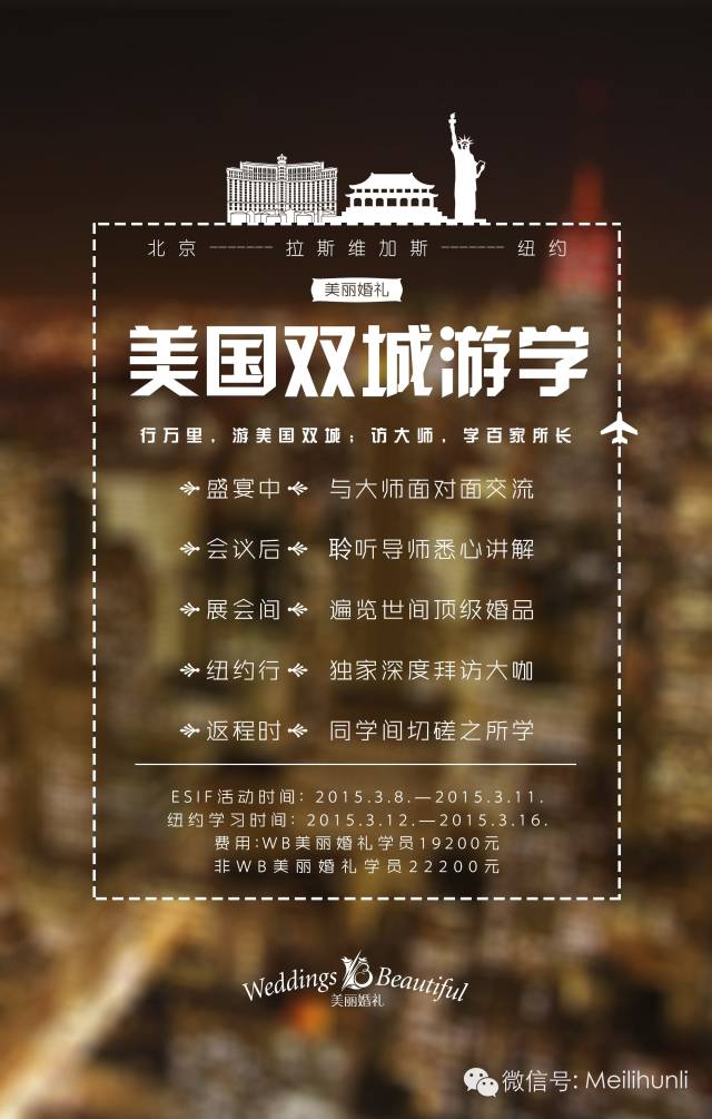 2015年3月7日~16日,WB美丽婚礼将开启美国双城游学之旅。第一站位于拉斯维加斯,正值一年一度的Event Solutions盛会期间,你可以选择聆听逾百位国际顶级大师的专业课程,除了欣赏诸位大师的作品及个人风采,还可以面对面交流、探讨,机会实属罕见。http://mmbiz.qpic.cn/mmbiz/tTfcKa22UTyOwX0wmBEFMhGibIFyzeVQM23MqXicnOxGia4bcHXNzyqm5JoRhN7WAq7tG4p2zaUSfhIITM4ouAZxQ/640?tp=webp