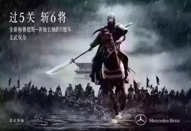 故事的开端,就是大名鼎鼎、实力雄厚,让奥迪A6L胆战心惊的奔驰新E级的上市。然后,奔驰就发了一个广告。关二爷横刀立马,配了一个文字说明“过五关,斩六将”。汽车圈谁不知道,在C级车这个领域,向来是奥迪A6L与宝马5系的巅峰对决,其他人根本就只有看热闹的份。