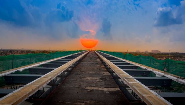 中低速磁浮道岔由固定垛梁、主动梁和从动梁等部分组成,为箱型钢梁结构。道岔由安装在主动梁底的电机带动主动梁和从动梁整体移动,朝开通方向接入预定进路。
