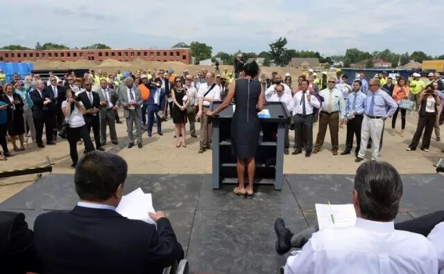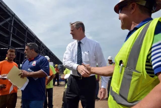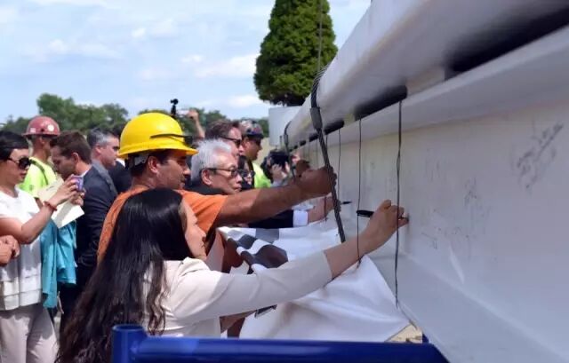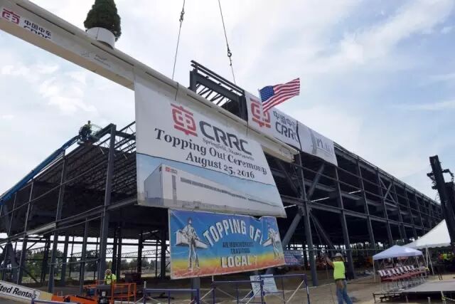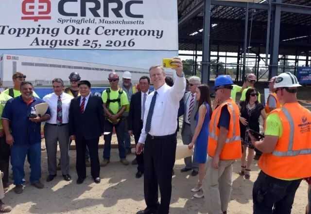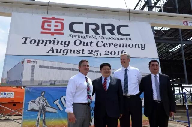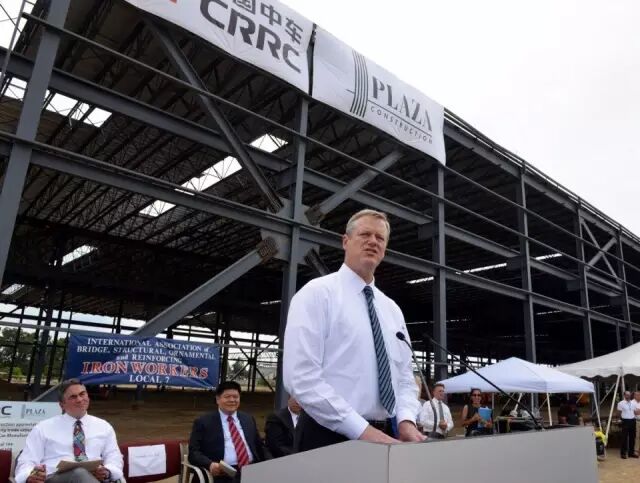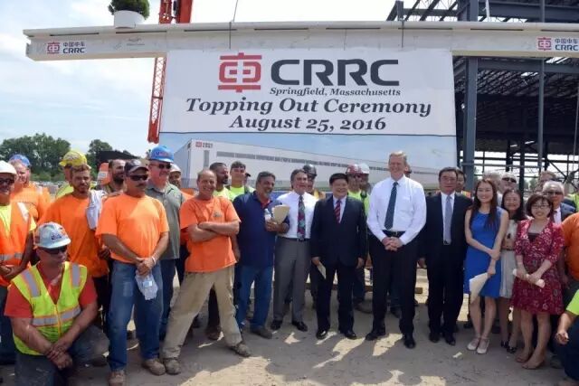 当地时间8月25日,中国中车在位于美国马萨诸塞州春田市的工厂内举行了隆重的厂房平顶仪式。马萨诸塞州州长贝克(Charlie Baker)、马萨诸塞州春田市市长萨诺(DomenicSarno)、中国中车副总裁余卫平出席了这一仪式。