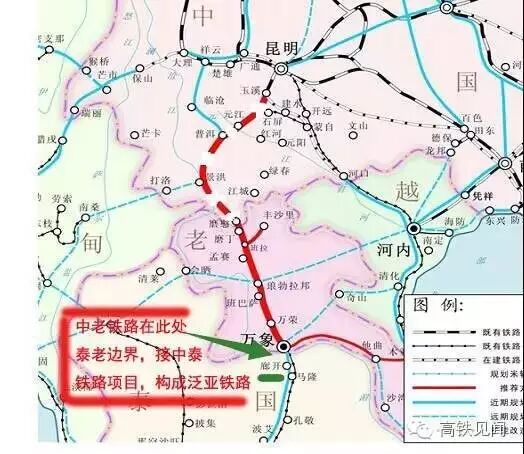 中老高铁意义重大,就在于它是连接中国与东南亚的中间路段,就是上面那张图上,见闻君用绿色箭头标着的地方,那里就是中老铁路与中泰铁路的连接点。中泰铁路就从那里开始一直延伸,到泰国南部港口城市曼达普。远期规划,就是连接马来西亚直到新加坡。它们都是泛亚铁路的一部分。什么泛亚铁路,下面这张图就是泛亚铁路网,通过大理、昆明、南宁三个城市,将中国与东南亚连成一张大网,连成一张谁都离不开谁的大网。