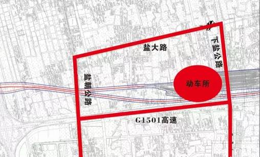 动车所位于上海绕城高速(G1501)以东,拱极东路以北,规划盐大路以西,盐朝公路以南,规划检修库线10条,存车线40条,北段咽喉西侧设置维修工区1处,规划控制规模约58公顷。