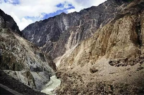 怒江峡谷的险峻震撼,是没有到过的人难以想象的,在海拔仅2700米、宽不过百米的河谷底抬头望去,两边都是海拔4400米以上的荒山,海拔落差1700米,峭壁千仞、危岩嶙峋,寸草不生,苍凉莽莽。不少江岸都是垂直的石壁,更有大面积的碎石滑坡,令人胆战心惊。