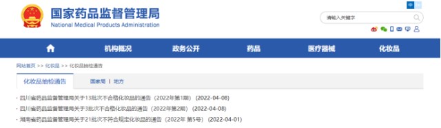 2022年4月8日,四川省药品监督管理局相继发布《关于13批次不合格化妆品的通告》(2022年第1期)、《关于3批次不合格化妆品的通告》(2022年第2期)。
