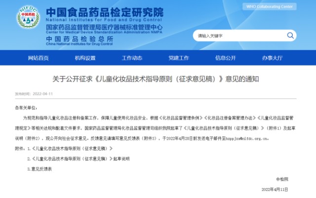 2022年4月11日,中国食品药品检定研究院发布关于公开征求《儿童化妆品技术指导原则(征求意见稿)》意见的通知,进一步明确了儿童化妆品相关技术要求。