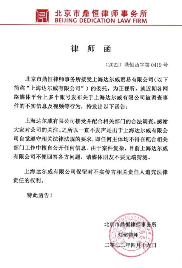对此传闻,刚刚恢复发言的达尔威公司官方微博,通过账号“TST庭秘密”于2022年4月19日下午发布《郑重声明》,声明显示【北京市鼎恒律师事务所接受达尔威公司的委托,为正视听,就近期各网络媒体平台上多个账号发布关于达尔威公司被调查事件的不实信息及视频等行为,特发出以下函告:达尔威公司接受并配合相关部门的合法调查。感谢大家对公司的关注。之所以一直不发声是出于达尔威公司自觉遵守相关法律法规的要求,即任何主体均不得在配合相关部门工作中擅自公开任何信息。由于案件复杂,目前达尔威公司不便回答各方问题,请媒体朋友不要无端猜测。达尔威公司保留对不实传言相关责任人追究法律责任的权利。】