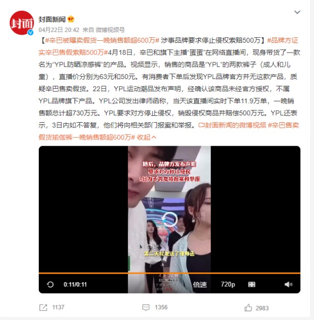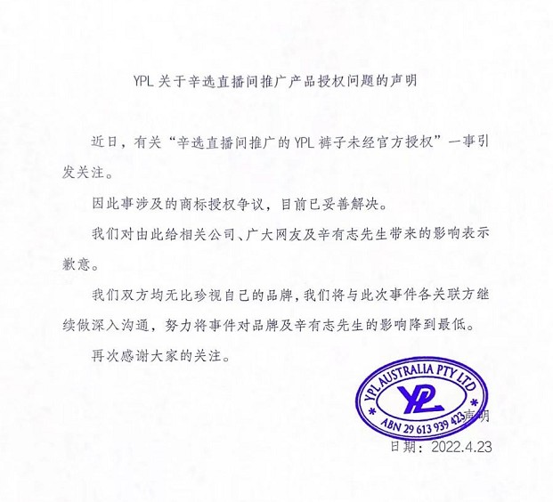 辛巴团队涉嫌售卖假货YPL产品有了最新进展:2022年4月23日深夜,“YPL运动潮品”官方微博发布声明,称“因此事涉及的商标授权争议,目前已妥善解决。对由此给相关公司、广大网友以及辛有志带来的影响表示歉意。”