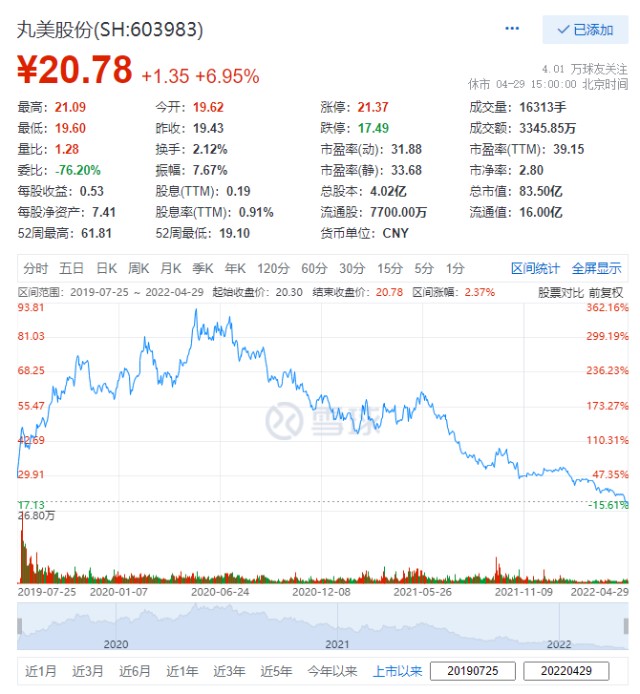 伴随业绩的下滑,丸美股份的股价不断下滑,屡创新低。截止2022年4月29日A股收盘,丸美股份为20.78元/股,总市值为83.5亿元,不足2020年5月29日最高股价91.79元/股的四分之一。