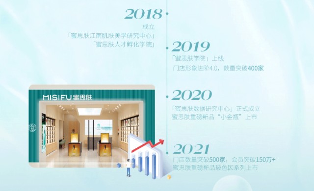 蜜思肤官网显示,2012年蜜思肤第一家单品牌店诞生,2014年连锁店突破100家,2021年公司门店数量突破500家,会员突破150万+。