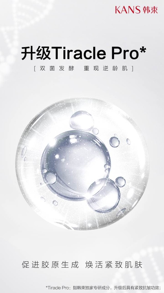 近两年,韩束对基础研究成果进一步深耕,在深层补水的基础上引入抗衰新功效,将原本TIRACLE中的酵母菌替换为长寿菌纳豆芽孢杆菌,与嗜热栖热菌共同发酵,最终得出TIRACLE的二代升级——抗老型TIRACLE PRO,上美集团的基础研究再上一个新的台阶。