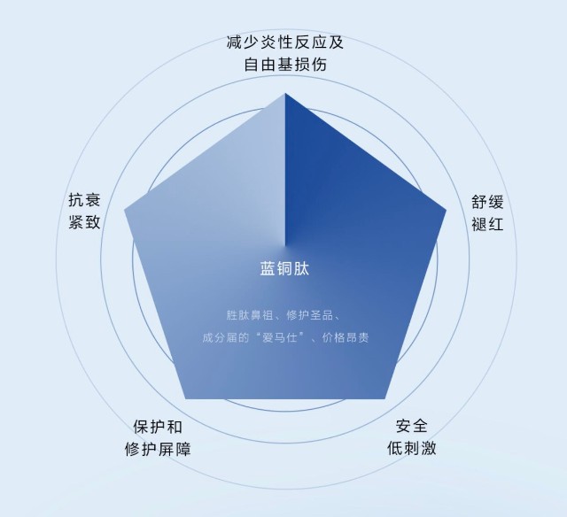 在护肤方面,成分界的“爱马仕”蓝铜肽具备五个维度的天然优势——减少炎性反应及自由基损伤、抗衰紧致、保护和修护屏障、舒缓褪红、安全低刺激。