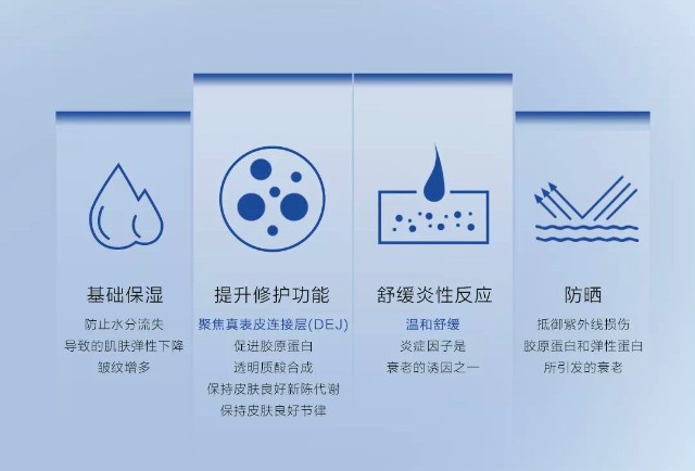 配方从两大维度实现抗衰,第一,蕴含纯度高达99%的蓝铜肽,促生肌肤I型胶原,强韧DEJ,实现肌理抗皱,多维修护;第二,将自主基础研究成果TIRACLE PRO与蓝铜肽进行复配,协同增效,实现舒缓炎性反应的作用。