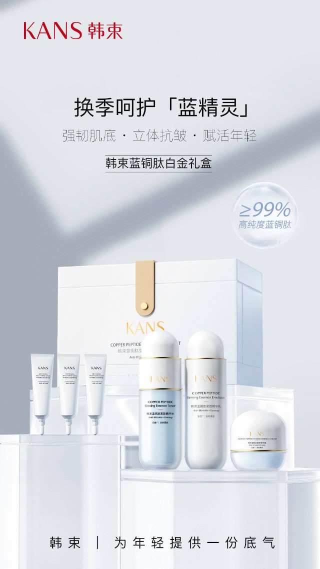 上美集团旗下“科学抗衰”品牌韩束,在接连推出金刚侠面膜、双A醇精华等广受好评的热门单品之后,又迎来抗衰产品矩阵的“一员大将”——蓝铜肽白金系列。