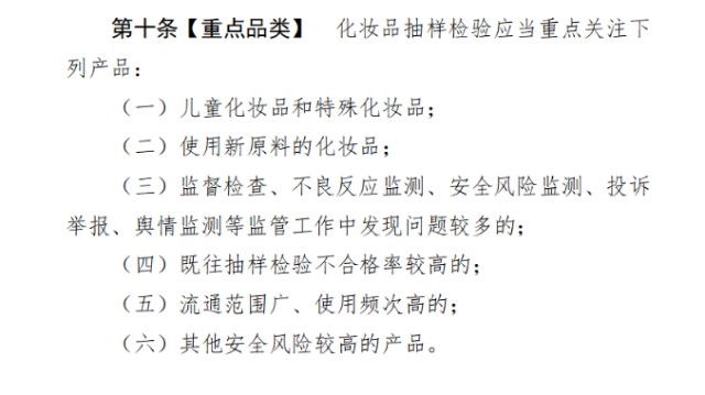 在《管理办法》第十条重点品类中:化妆品抽样检验将重点儿童化妆品和特殊化妆品。