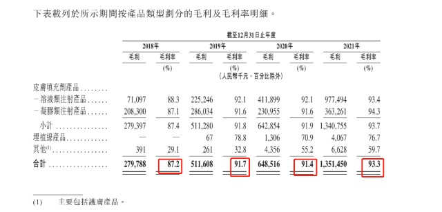 2018年——2021年,爱美客的毛利率分别为87.2%、91.7%、91.4%和93.3%,同期净利润为36.1%、53.4%、61.1%和66.1%。