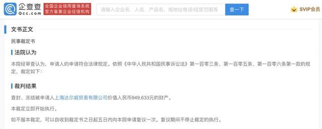 此后达尔威还被法院冻结大量财产。企查查APP显示,达尔威被法院查封、冻结价值约人民币94.96万元的财产,其原因是该公司与得盛(上海)建筑设计咨询有限公司相关建设工程设计的合同纠纷。