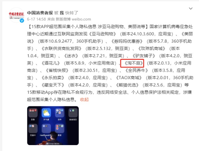 近日,国家计算机病毒应急处理中心通过互联网监测,发现15款移动App存在隐私不合规行为,违反网络安全法、个人信息保护法相关规定,涉嫌超范围采集个人隐私信息。其中,《淘不庭》(版本