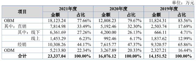 招股书显示,锦波生物的销售模式为OBM和ODM两种销售模式。OBM模式是指锦波生物生产、销售自有品牌产品,ODM模式指锦波生物根据客户需求,设计、生产符合要求的相关产品,并贴上客户的品牌对外销售。而OBM销售中,根据销售渠道可进一步分为经销与直销。