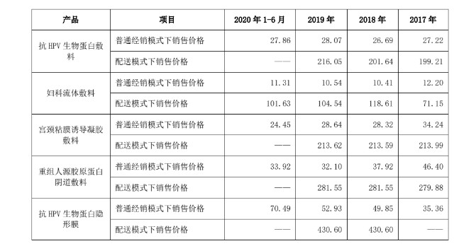 数据显示,2017年-2019年,抗HPV生物蛋白敷料普通经销模式下销售价格分别为27.22元/盒、26.69元/盒和28.07元/盒;配送模式下销售价格为199.21元/盒、201.64元/盒和216.05元/盒,价格相差分别为7.32倍、7.56倍和7.7倍。