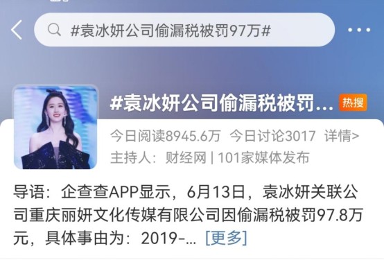 昨日(2022年7月4日),微博话题“袁冰妍关联公司偷逃税被罚97万”冲上热搜,引发众人关注。