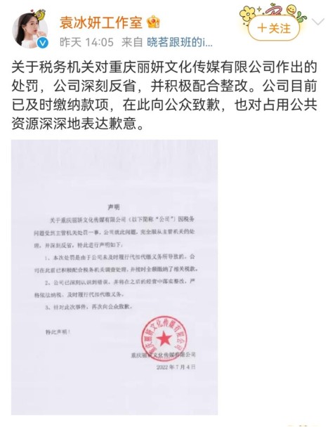 2022年7月4日下午,袁冰妍工作室对外发布道歉声明,称:关于税务机关对重庆丽妍文化传媒有限公司作出的处罚,公司深刻反省,并积极配合整改。公司目前已及时缴纳款项,在此向公众致歉,也对占用公共资源深深地表达歉意。