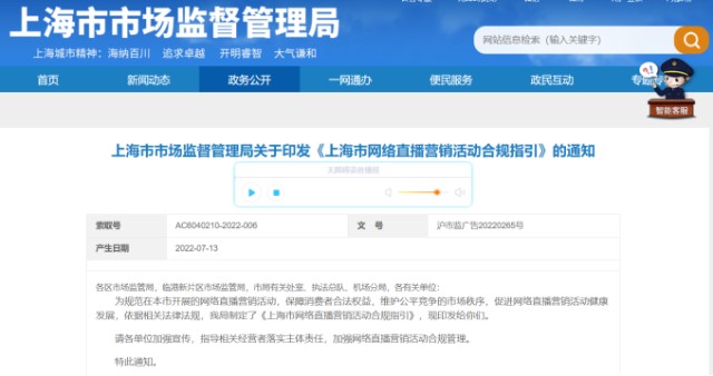 近日,为规范网络直播营销活动,保障消费者合法权益,维护公平竞争的市场秩序,促进网络直播营销活动健康发展,依据相关法律法规,上海市市场监管总局制定了《上海市网络直播营销活动合规指引》(以下简称《指引》)。