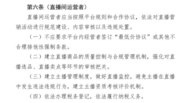 其中,值得注意的是,在第二章主体合规要求中对直播间运营者提出了以下要求:直播间运营者应当按照平台规则和合作协议,依法对直播营销活动进行规范建设、内容审核以及违规处置。