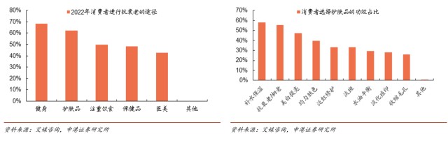 申港证券研究所的研报显示,抗衰老护肤品消费需求已经创了新高。从抗衰途径上看,2022 年62.4%的消费者选择使用护肤品抗击衰老,仅次于健身(68.2%);从护肤品功效选择上看,55.6%的消费者注重抗衰老/初老功效,仅次于补水保湿(57.8%)。
