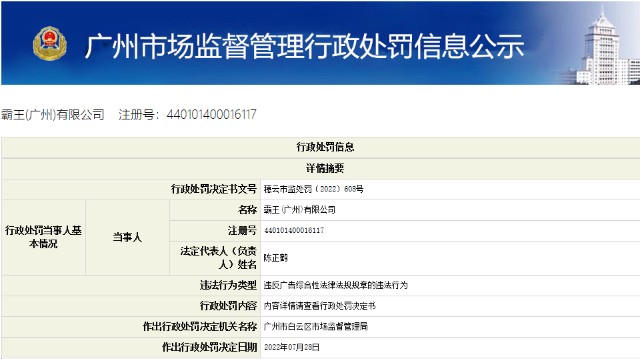 广州市市场监督管理局官网的行政处罚决定书文号《穗云市监处罚〔2022〕608号》显示,2021年12月29日,广州市白云区市场监督管理局在霸王集团现场检查发现当事人在微信小程序上销售产品时,涉嫌发布虚假广告。