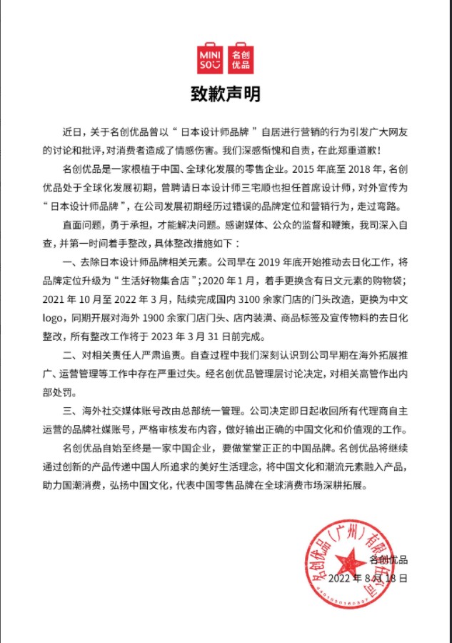 迫于舆论压力,2022年8月18日,在港交所和纽交所两地上市的名创优品通过官方微博发布了《致歉声明》,对其早期“日本设计师品牌”自居的营销行为,对消费者造成的情感伤害深感惭愧和自责,并郑重道歉。