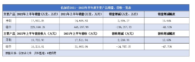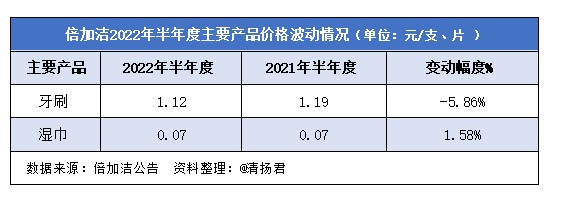 倍加洁的《关于 2022 年半年度主要经营数据的公告》显示,牙刷2022年半年度的均价为1.122元/支,同比递减5.86%;湿巾2022年半年度的均价为0.071片,同比增长1.58%。2022年倍加洁牙刷的销售增长增长12.63%,但均价下滑5.86%,压缩了牙刷的营业收入;而湿巾的价格虽然均价增长1.58%,但整体下滑47.7%,导致营收大幅下滑。