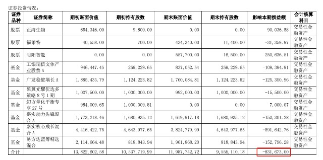 财报披露,倍加洁先后投资了正海生物、福莱特、明阳智能三支股票和工银瑞信文体产业股票 A等7支基金,期初账面价值为1382.26万元,不过除了正海生物、明阳智能和“幻方量化平衡专享27号”基金外,其他股票和基金全部亏损,影响本期损益额为83.17万元。