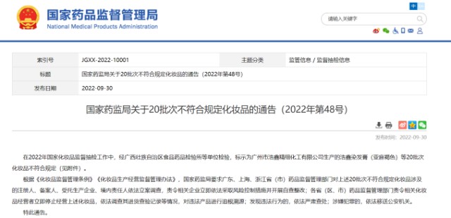 近日,国家药监局发布关于20批次不符合规定化妆品的通告。