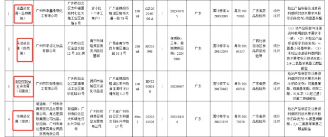 值得注意的是,其中,共有8批次染发膏产品不合规,分别是标示为广州市采洁化妆品有限公司生产的采洁染发膏(自然黑)、标示为广州市邦妮精细化工有限公司生产的BONYHAiR染发霜(闷青色)、标示为广州市妆典美容用品发展有限公司生产的妆典染发膏(绿色)和妆典染发膏(青绿色)、标示为广州威妮雅化妆品有限公司生产的金竹堂染发膏(酒红色)、标示为广州市神彩化妆品有限公司生产的卡佛尼炫彩染发露(自然黑)、标示为广州市天科化妆品有限公司生产的天科染发膏(自然黑)、标示为广州市靓鑫精细化工有限公司生产的玛奇诺润黑露(自然黑)-植物调理型。